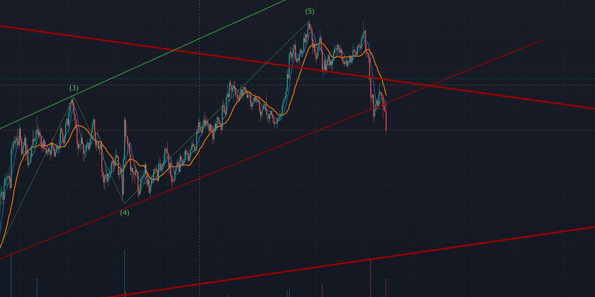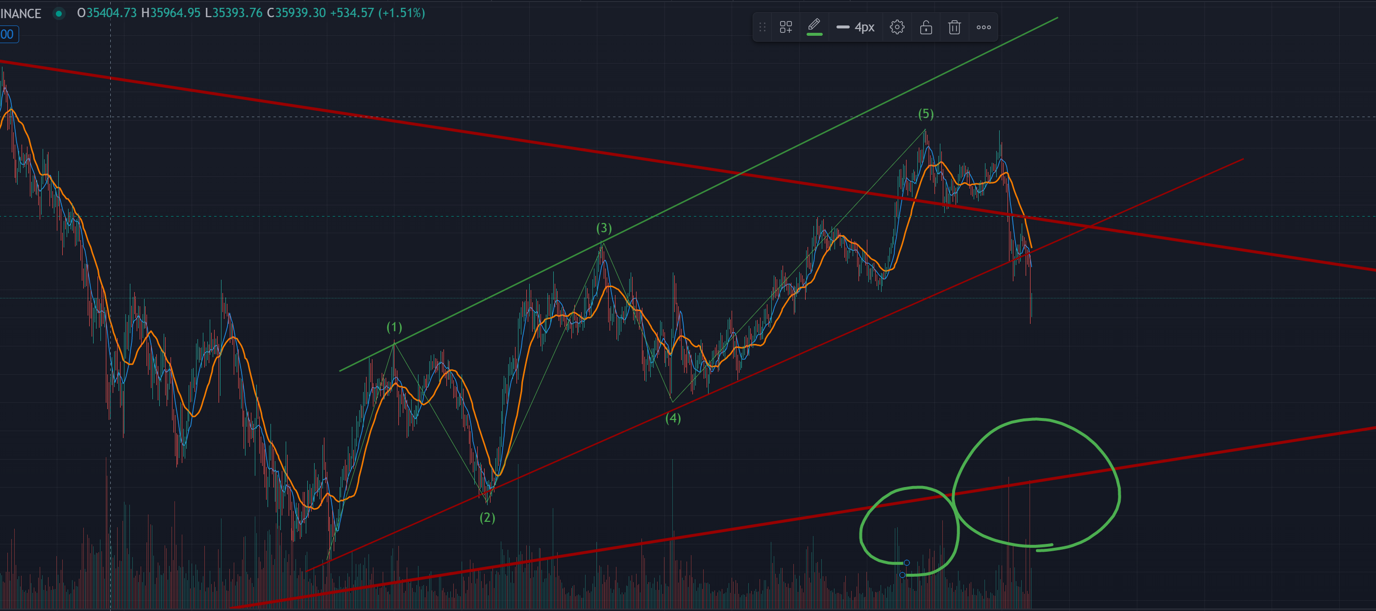 이때 다시 캔들의 긴꼬리를 보고 더블 탑이다 라는 판단이 생겨 전부 익절 + 숏으로 전환까지 진행했습니다. 이때의 손절가는 5파 고점으로 잡았습니다. 5파 고점을 넘는다면 더블탑으로 봤던 제 관점이 틀린거니까요. 그대로 비트코인은 하락했고 상승 추세선을 돌파했기에 아직 홀딩중입니다.