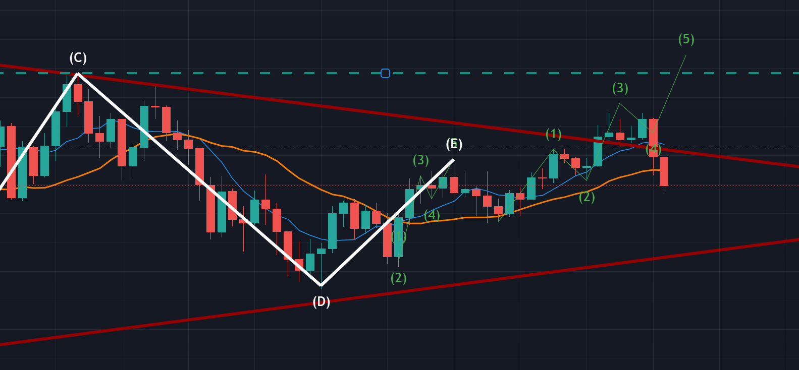 따라서 삼각 수렴 하방 추세선 까지 하락이 열려 있으며 언제든지 하락 할 수 있는 상황이 되었습니다.